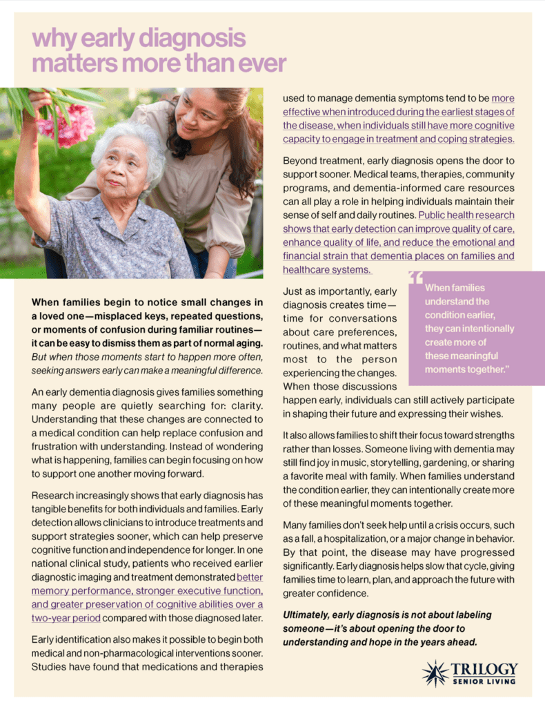 Our dementia experts are certified to meet residents exactly where they are in their journey. In this whitepaper, we address identifying those important, early signs.